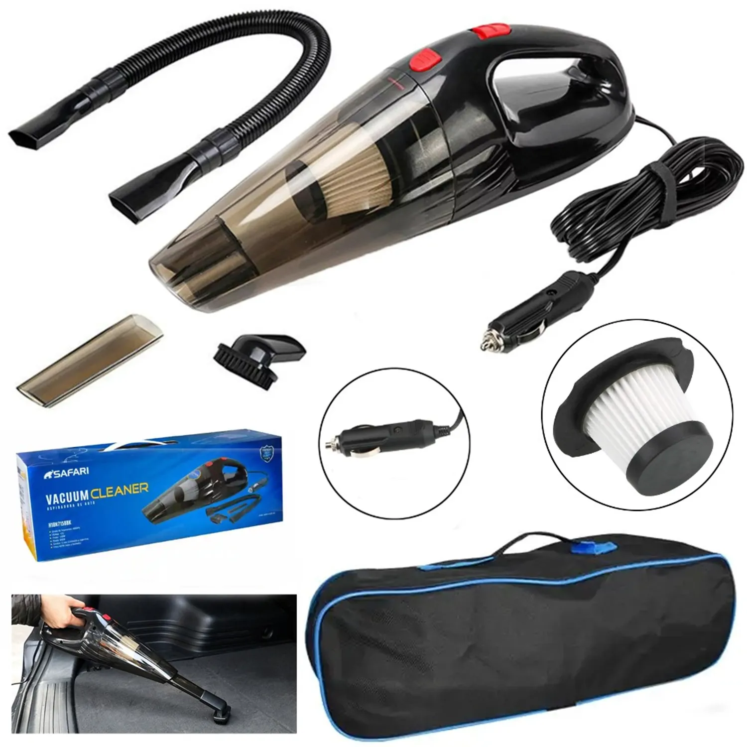 La Aspiradora de Mano SAFARI H18N7158BK es la aliada perfecta para mantener tu auto siempre limpio. Con su potencia de 120W y conexión de 12V al encendedor de cigarrillos, elimina de manera rápida y eficaz polvo, migas, arena y otros residuos.