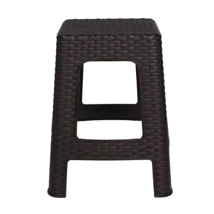 Este es un banco de plástico con diseño tipo ratán, práctico, liviano y resistente, ideal para uso en interiores y exteriores. Su estructura cuadrada y sus dimensiones compactas lo hacen perfecto para espacios reducidos.
